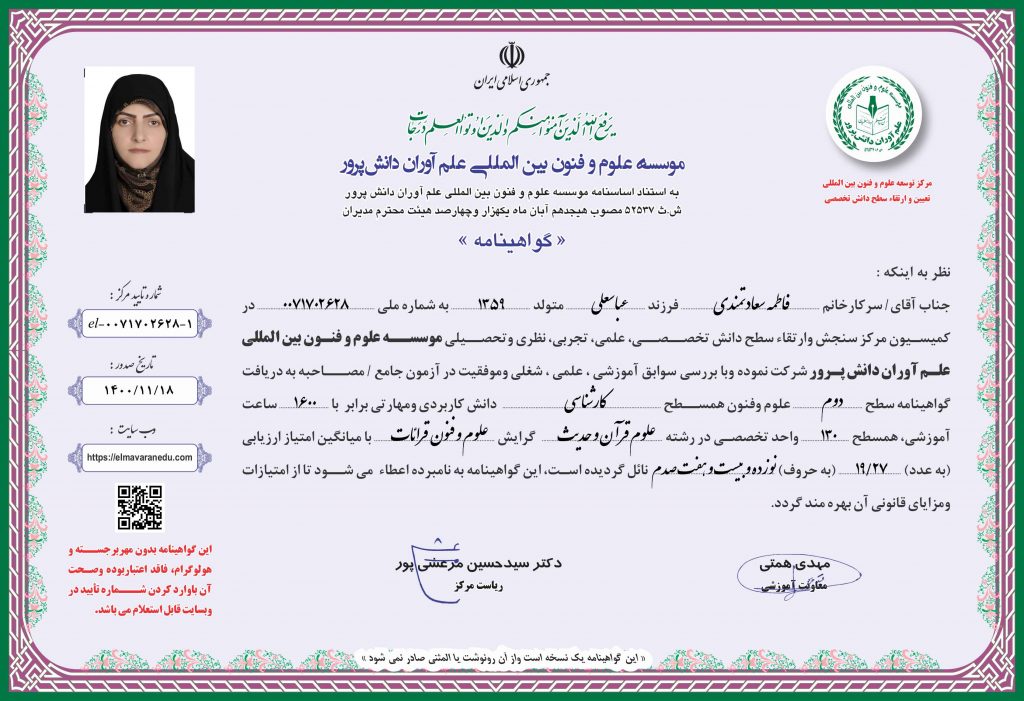 نظر به اینکه : سرکار خانم  فاطمه  سعادتمندی (صاحب عکس فوق) فرزند عباسعلی متولد 1359 صادره از  تهران شماره شناسنامه 7220 دارای شماره ملی 0071702628 در کمیسیون مرکز سنجش و ارتقاء سطح دانش تخصصی، علمی، تجربی، نظری و تحصیلی موسسه علوم و فنون بین المللی علم آوران دانش پرور شرکت نموده و با بررسی سوابق آموزشی، علمی، شغلی و موفقیت در آزمون مصاحبه به دریافت گواهینامه سطح دوم علوم و فنون همسطح کارشناسی دانش کاربردی و مهارتی برابر با 1600 ساعت آموزشی، همسطح 130 واحد تخصصی در رشته علوم قرآن و حدیث  و گرایش علوم و فنون قرائات  با میانگین امتیاز ارزیابی 19/27  نوزده و بیست و هفت صدم نائل گردیده است.
