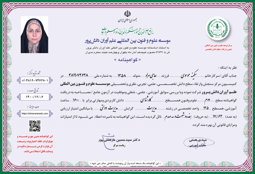 نظر به اینکه : سرکار خانم سکینه موسوی (صاحب عکس فوق) فرزند حاجی مراد متولد 1358 صادره از باغملک شماره شناسنامه 226 دارای شماره ملی 4819074628 در کمیسیون مرکز سنجش و ارتقاء سطح دانش تخصصی، علمی، تجربی، نظری و تحصیلی موسسه علوم و فنون بین المللی علم آوران دانش پرور شرکت نموده و با بررسی سوابق آموزشی، علمی، شغلی و موفقیت در آزمون مصاحبه به دریافت گواهینامه سطح دوم علوم و فنون همسطح کارشناسی دانش کاربردی و مهارتی برابر با 1600 ساعت آموزشی، همسطح 135 واحد تخصصی در رشته مدیریت و گرایش مدیریت دولتی با میانگین امتیاز ارزیابی 17/63 هفده و شصت و سه صدم نائل گردیده است.