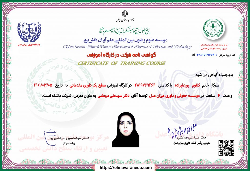 بدینوسیله گواهی می شود سرکار خانم کلثوم پورعلیزاده به شماره ملی 4819769464 در کارگاه آموزشی سطح یک داوری مقدماتی به تاریخ 1401/03/05 و مدت 4 ساعت در موسسه حقوقی و داوری میزان عدل توسط آقای دکتر سیدعلی مرعشی به عنوان مدرس، شرکت داشته است.